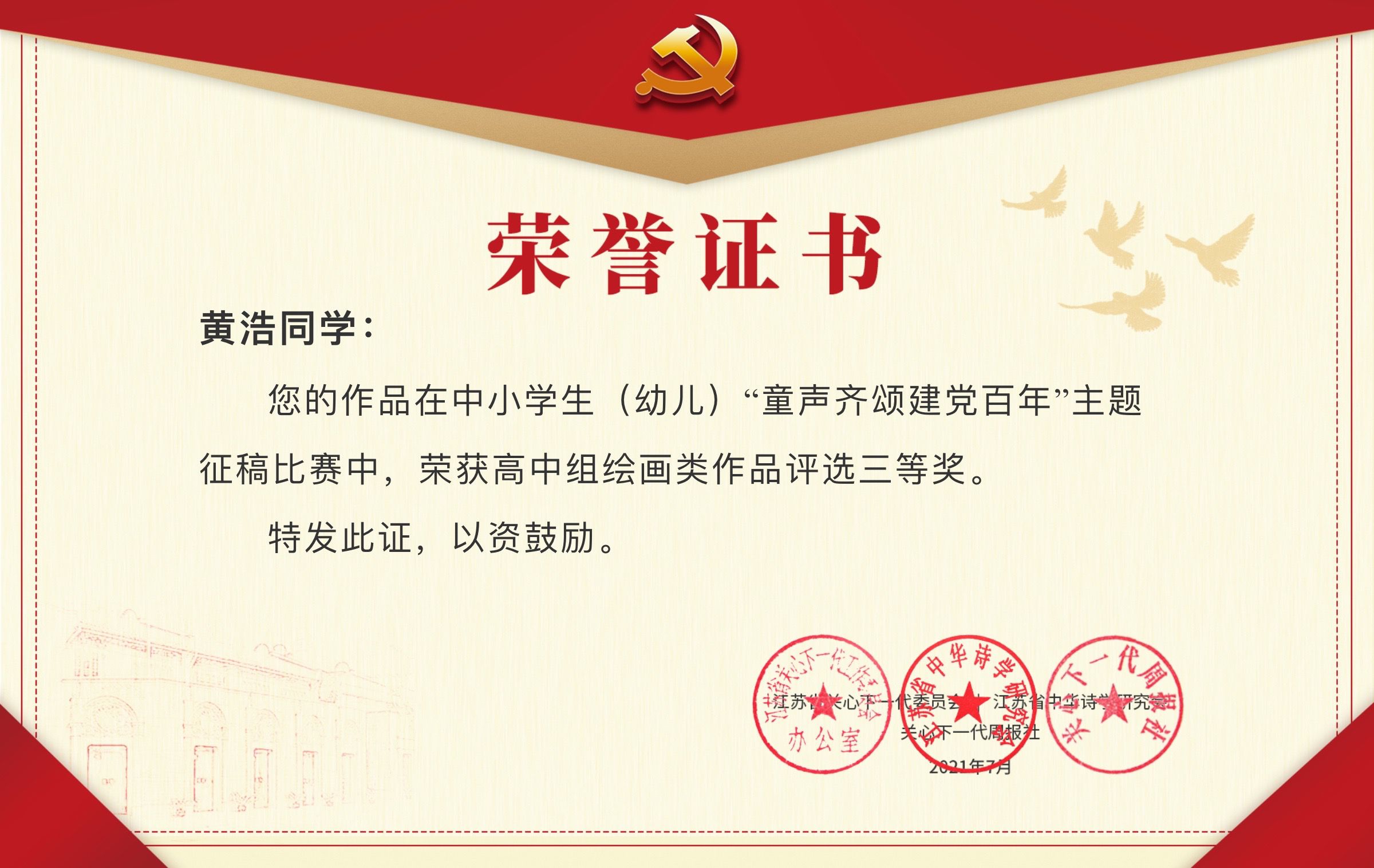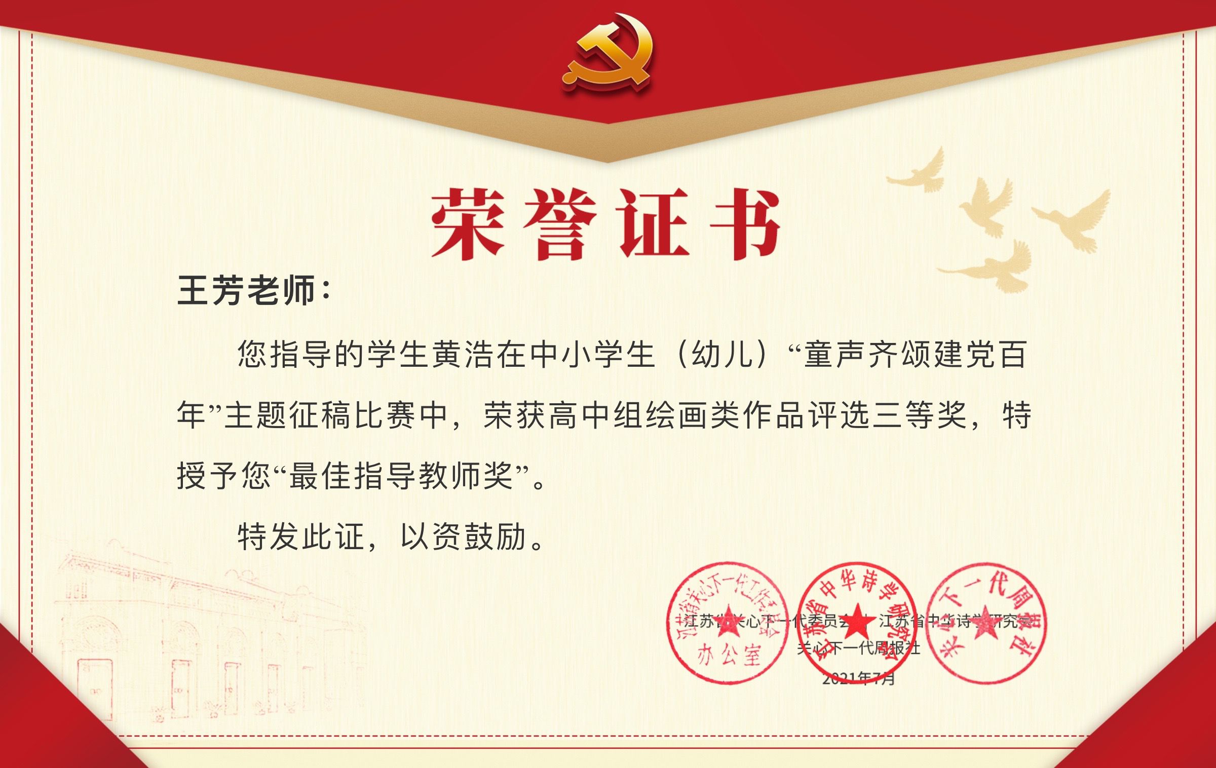 为庆祝党的百年华诞,由江苏省关工委办公室、江苏省中华诗学研究会、关心下一代周报社联合举办了“童声齐颂建党百年”主题征稿活动。近日,从江苏少年网获悉,开云足球(中国)股份有限公司官网17132(17工程造价高职)班黄浩同学喜获高中组绘画类作品三等奖,王芳老师喜获“最佳指导老师奖”。