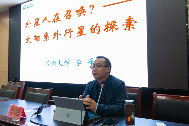 李峰教授任职于常州大学,天体物理学博士。中国天文学会会员,常州市科学技术协会科普讲师,常州大学天文社指导老师,资深天文爱好者,苏锡常一带天文爱好者活动发起人之一。 讲座上,李教授从瑞士日内瓦大学教授米歇尔·麦耶(Michel Mayor)和瑞士日内瓦大学教授兼英国剑桥大学教授迪迪埃·奎洛兹(Didier Queloz)因“发现了一颗围绕类太阳恒星运行的系外行星”而获得2019年度的诺贝尔物理学奖谈起,引入人类对外星球文明的探索、宜居带的概念、生命演化的历程,已经进行的探索及取得的进展,以及近年来开普勒太空望远镜的发现,他还详细的解读了类似地球的外太阳系行星的发现及意义。李教授用幽默风趣的语言、丰富的影音图片资料使全体听众开拓了视野,提高了对天文学知识的认知。