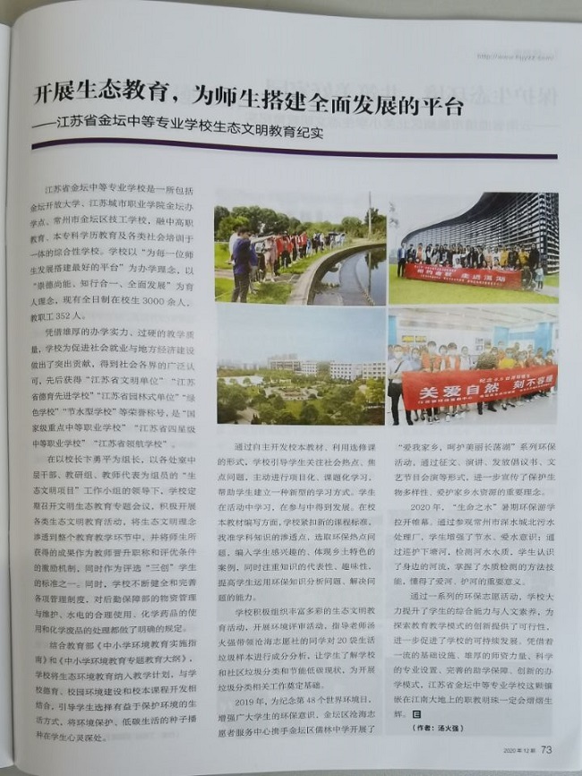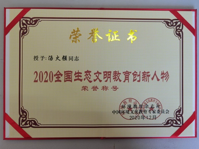 近日,我校被中国环境文化教育专家委员会、《环境教育》杂志社评为“2020全国生态文明教育特色学校”并颁发奖牌,授予学校沧海志愿者服务中心汤火强老师“2020全国生态文明教育创新人物”。