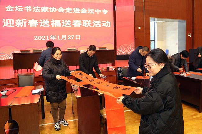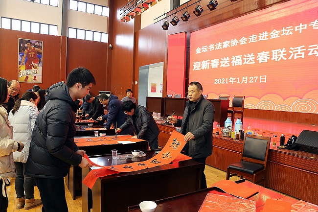 2021年新春即将来临,为学习贯彻党的十九大精神、弘扬优秀传统文化,践行社会主义核心价值观,活跃校园文化氛围,同时表达对广大教职员工最诚挚的节日祝福,1月27日,我校特邀请金坛书法名家走进学校开展迎新春送福送春联活动。