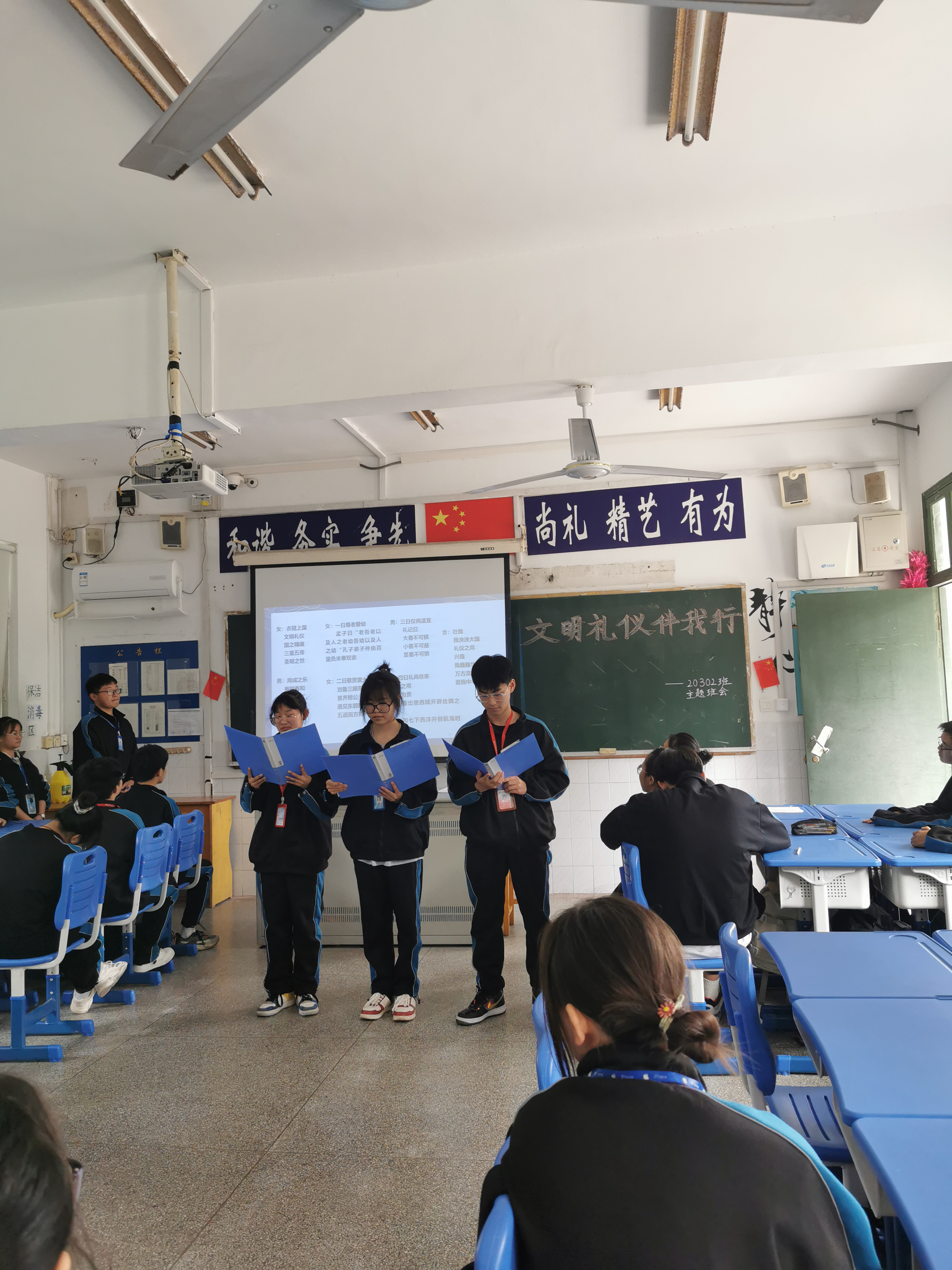 第五环节:读一读:班长汪远敏,郭志,李子煜读《中华礼仪》,结尾请同学们一起朗读。为了陶冶道德情操、增强同学们的礼仪意识.