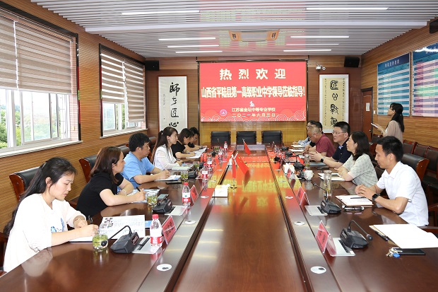 6月3日,山西省平陆县第一高级职业中学党办主任王宏瑞、党办副主任赵丽娜、团委书记苗瑞红、办公室副主任吴宇翔、教务副主任郭屹孟一行6人莅临我校参观考察。在校长卞勇平、党总支书记林静的陪同下,考察团一行首先深入校园,实地考察学校实训基地、生活设施、体育场馆,了解我校开设专业、在校生规模、实训设备等情况。 随后,来宾并与我校领导进行了友好座谈。我校卞勇平校长、林静书记、李建中副校长、杨益粉副校长、汤英俊副校长、许琴主任、校企合作处葛益萍副处长参加了座谈会。 卞勇平校长首先对平陆县第一高级职业中学一行到来表示欢迎,接着介绍了学校的基本情况、办学层次、专业建设及师资队伍,并表达了两校合作办学的美好愿望。 座谈会在轻松融洽的氛围中进行,与会人员就学生日常管理、教学管理、校企合作、德育教育、党务工作,学校特色,教师队伍建设等问题进行了交流和研讨,并提出了许多建设性的意见和建议。 考察团一行对金坛区职业教育发展给予了高度评价,认为我校依托产业办专业,举措有力,成果显著,呈现出很多亮点和特色,希望双方密切交流学习,搭建合作平台,互相分享成功经验和先进做法,办好职业教育,更好地服务地方经济社会发展。
