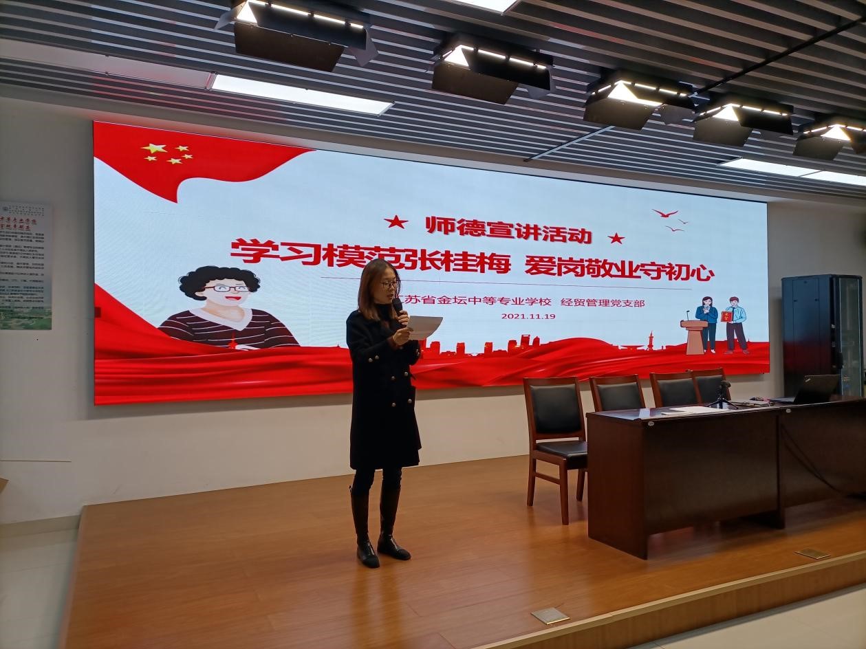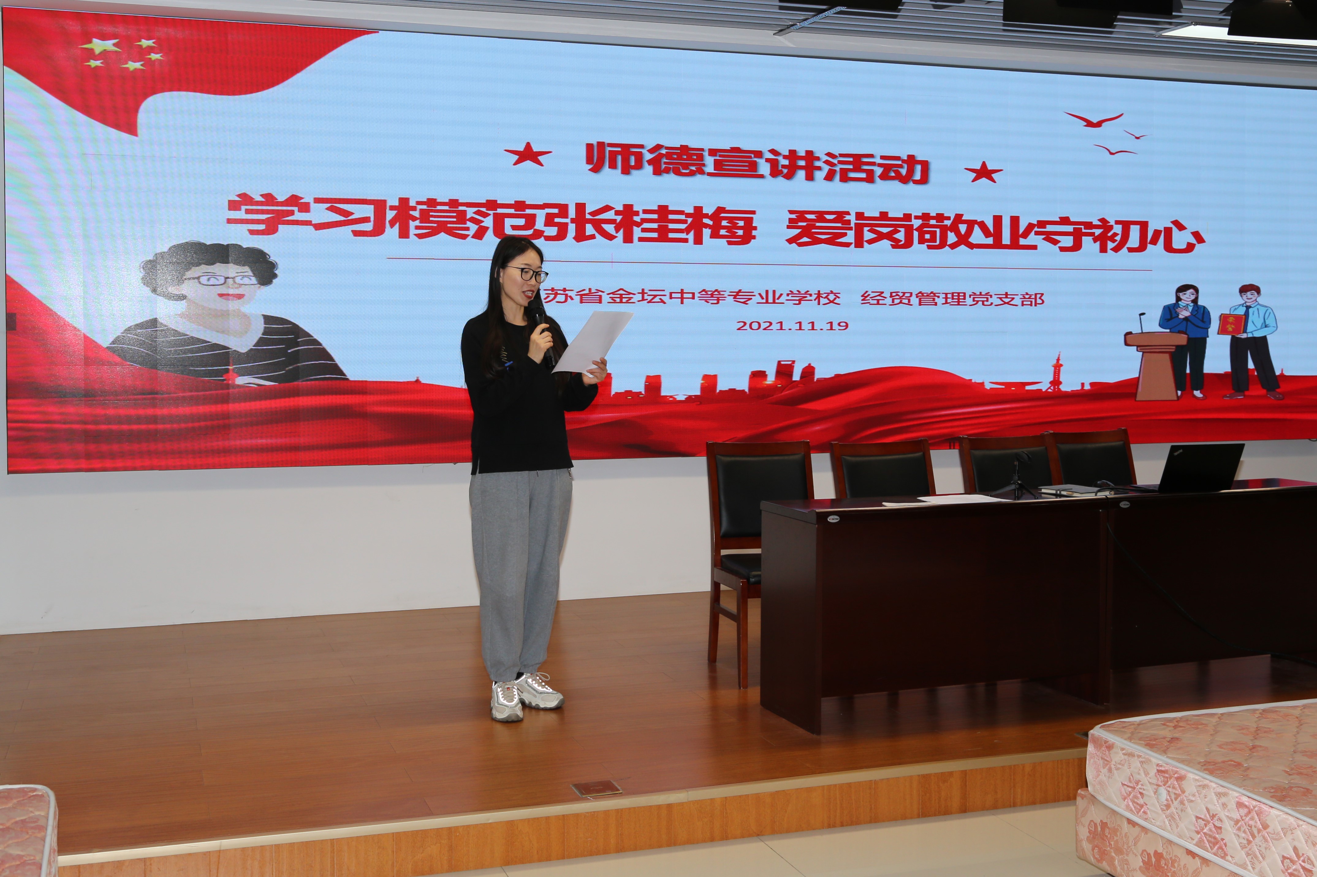为积极响应中共常州市委宣传部和中共常州市委教育工作委员会联合发文开展的“学习模范张桂梅,爱岗敬业守初心”主题活动,激发广大教师教书育人的积极性,弘扬高尚师德,全面落实立德树人根本任务,学校经贸管理系党支部于11月19日下午在校旅宾实训室举行了以“学习模范张桂梅,爱岗敬业守初心”为主题的青年党员教师演讲比赛,支部书记黄火俊同志主持,支委、支部全体党员参加了活动。