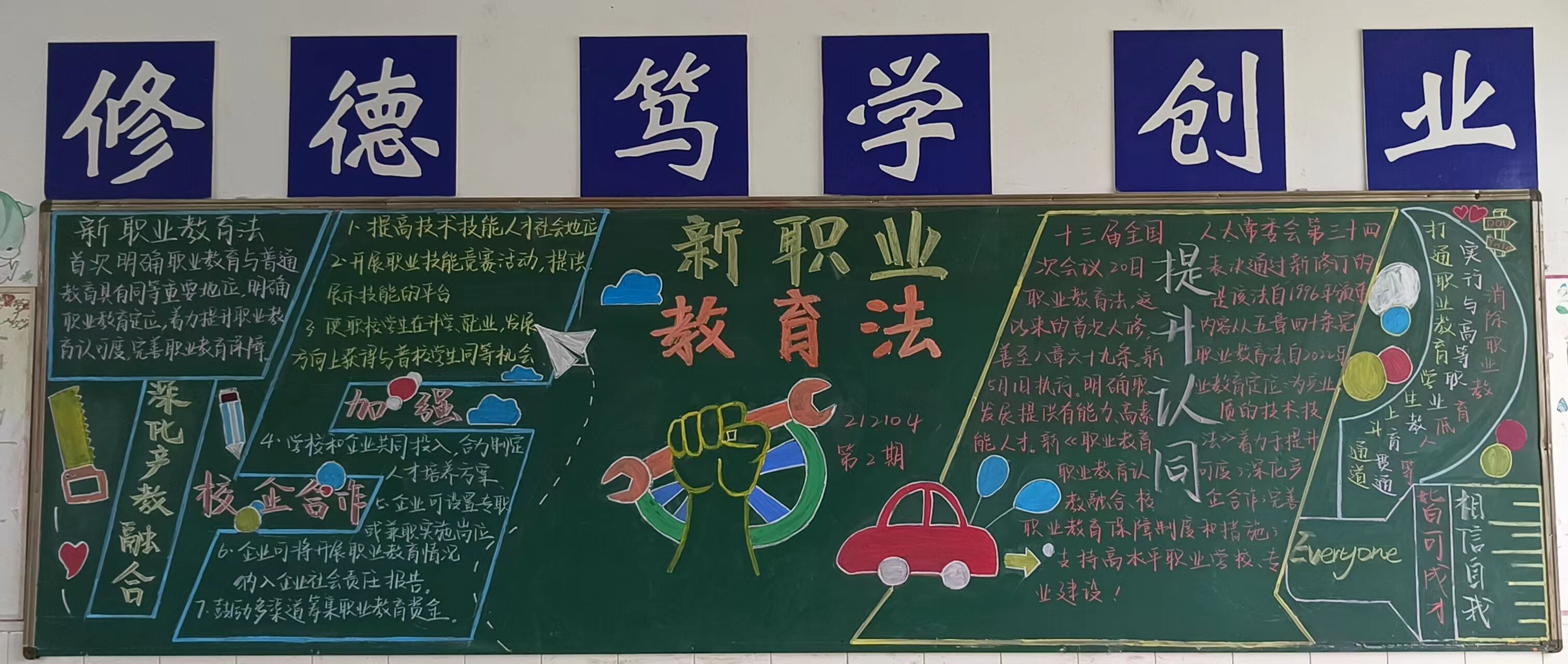 为深入宣传学习贯彻《中华人民共和国职业教育法》,扎实推动职业教育高质量发展,作为2022年职业教育活动周内容之一,我校党总支组织全体学生通过黑板报、主题班会及学生职业生涯发展规划等各种形式深入学习贯彻《中华人民共和国职业教育法》。