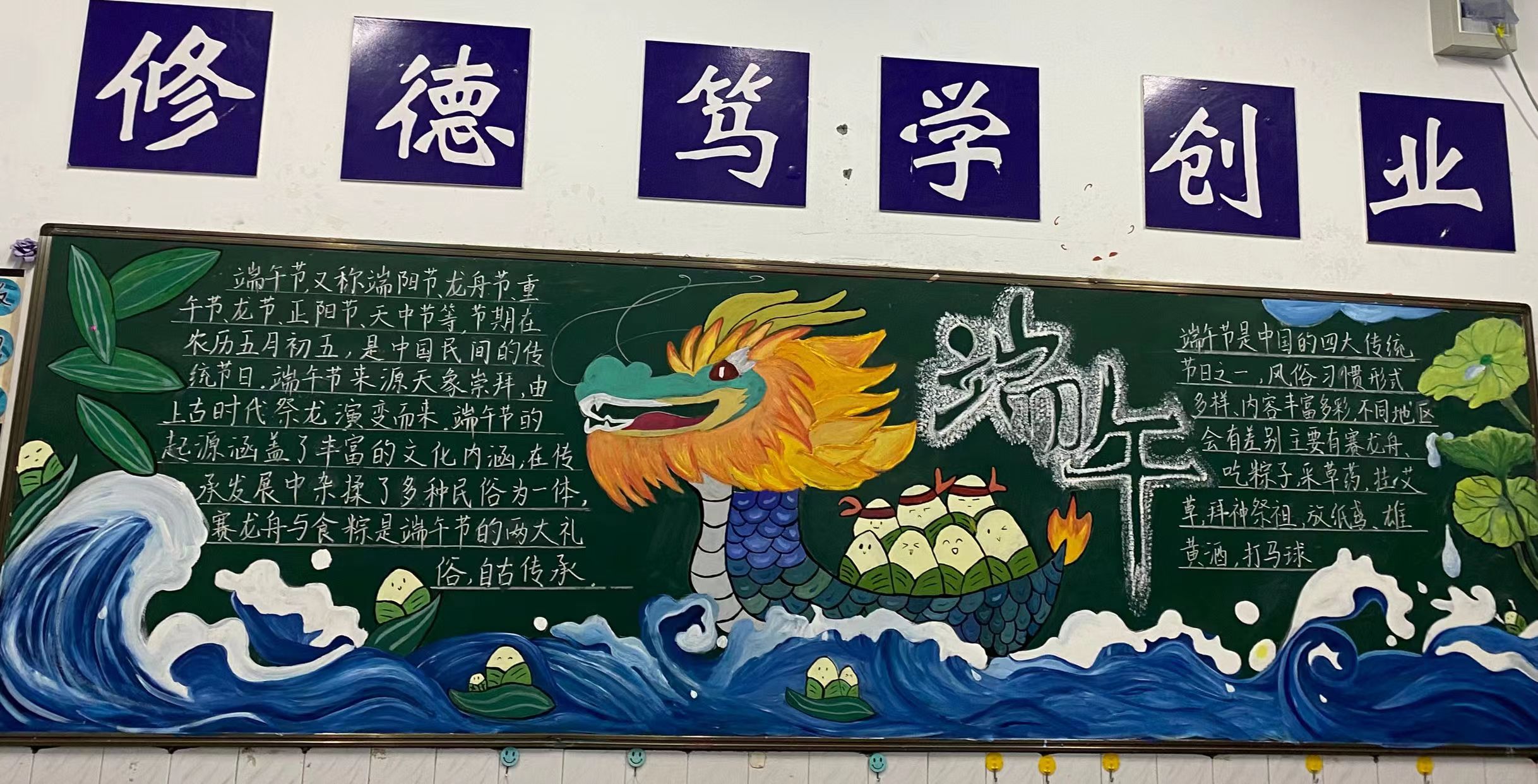 5月31日,各班开设端午节主题班会,同学们充分了解端午节的由来、习俗、文化影响、经典诗词等。同学们共读《史记》中屈原的故事,通过了解屈原的经历,对其爱国主义情怀产生了极大的敬佩,树立了为中华之崛起而读书的远大志向。同时各班以纪念屈原、赛龙舟、包粽子等为主要元素,精心策划,分工合作,多渠道搜集资料,巧妙排版设计创作了一幅幅图文并茂的黑板报作品。