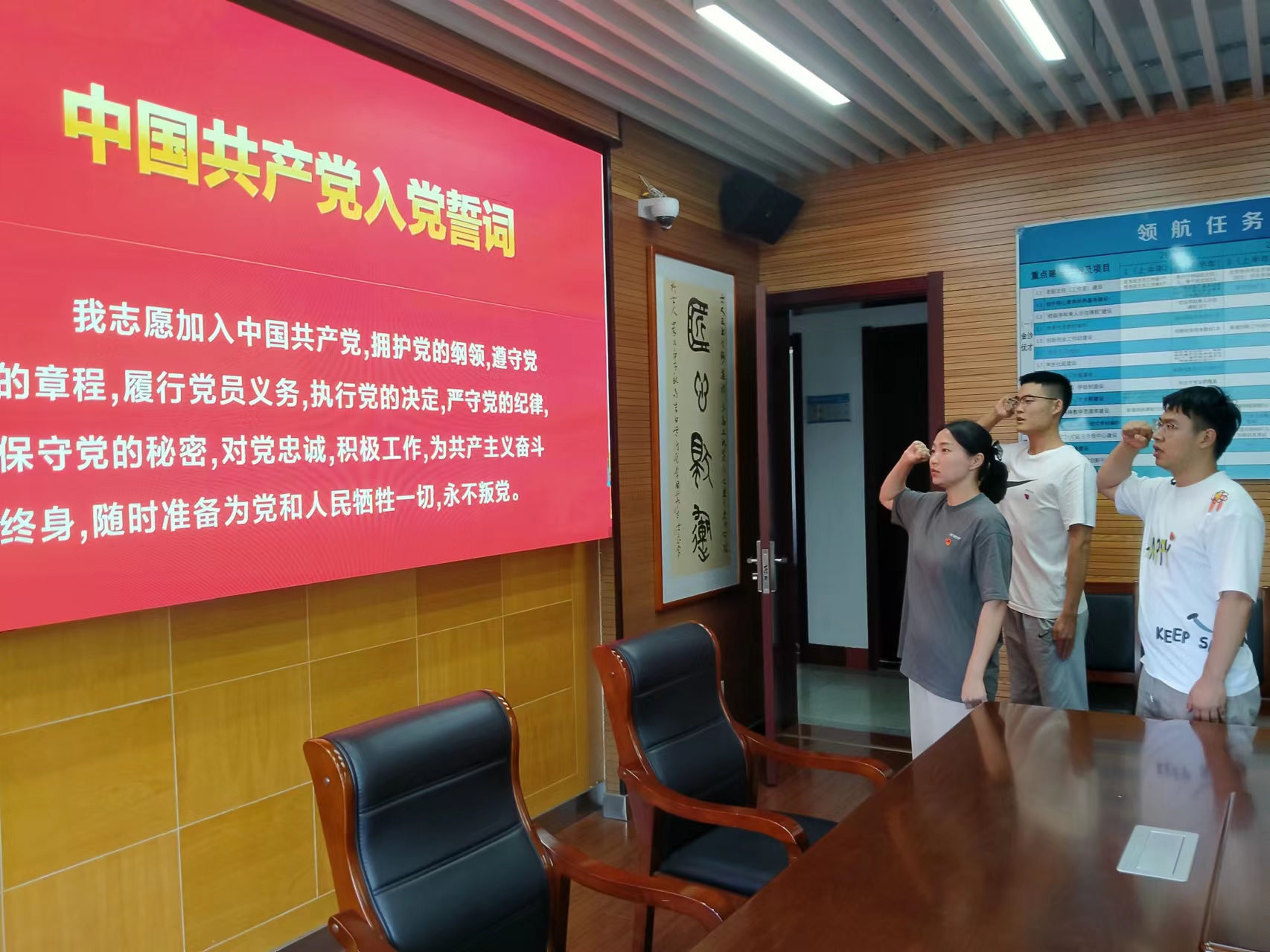 接着2021年转正的王迪、代建两位同志和支部全体党员同志们重温入党誓词。党支部组织委员顾春燕同志作为领誓人,带领大家高声宣读入党誓词:“我志愿加入中国共产党……”。这铿锵有力的宣誓声,让党员同志们再一次体验党员身份的光荣、党员使命的崇高,表达了全体党员同志坚定的政治信念和时刻不忘初心、矢志不渝奋斗的坚定决心,宣誓过程庄严神圣。