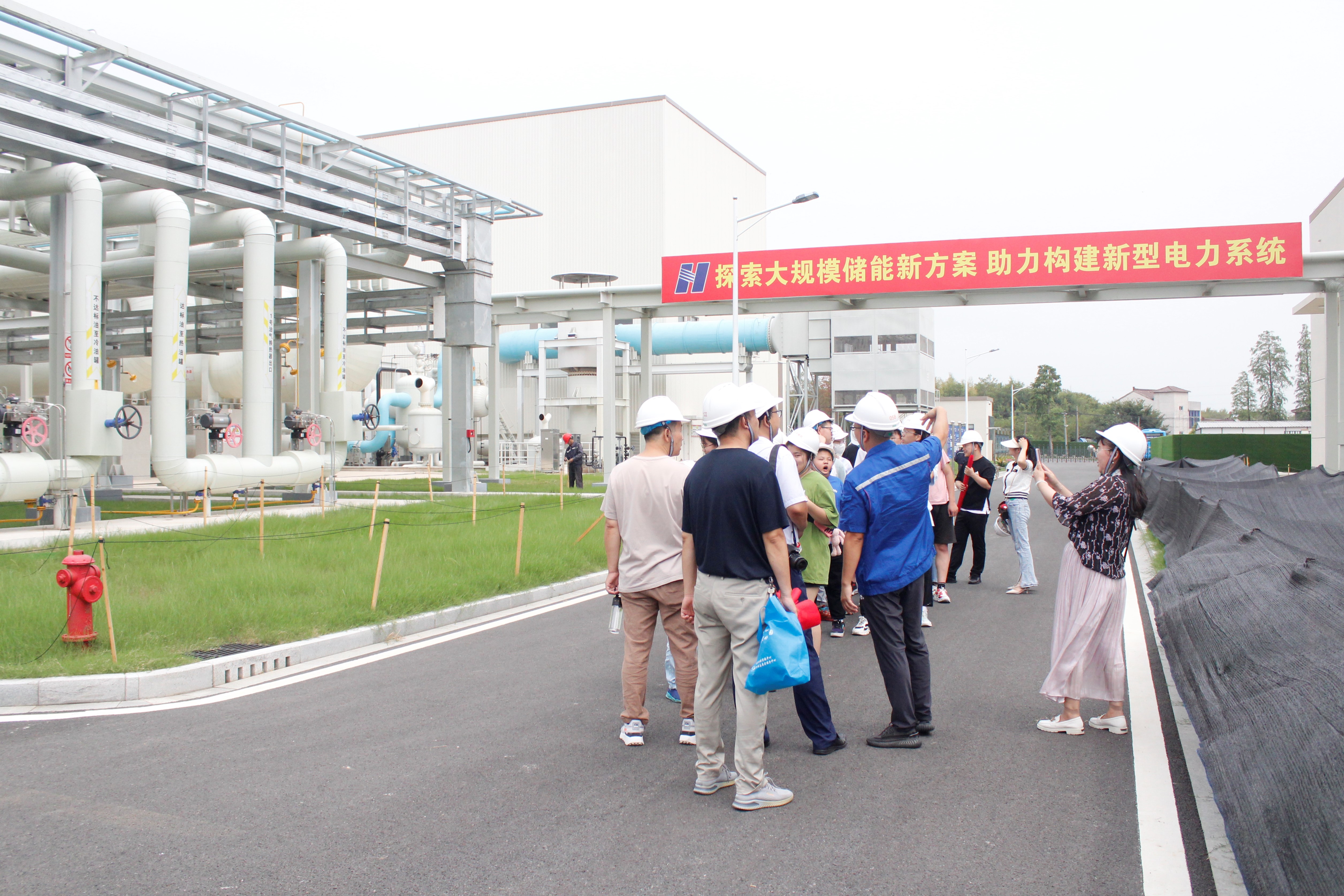 随后,一行人来到金坛直溪的盐穴压缩空气储能示范电站。盐穴压缩空气储能是利用水溶采盐后形成的巨大腔穴,在电网低谷时将空气压缩到盐穴中,用电高峰时再释放压缩空气发电,从而实现削峰填谷,提升电网调节能力,是构建新型电力系统、实现“双碳”目标的关键技术。它改传统电力“即发即用”现状,助力迎峰度夏。科技改变生活,它不仅是消除工业盐穴地质灾害风险,化害为利,申请专利百余项,建立了具有完全自主知识产权的技术体系,研发并验证了高负荷离心压缩机、高参数换热器、大型空气透平等首(台)套核心设备。参观完毕,大家感慨家乡的巨变,金坛也能走在世界的前列,“光伏小镇”再添新彩。