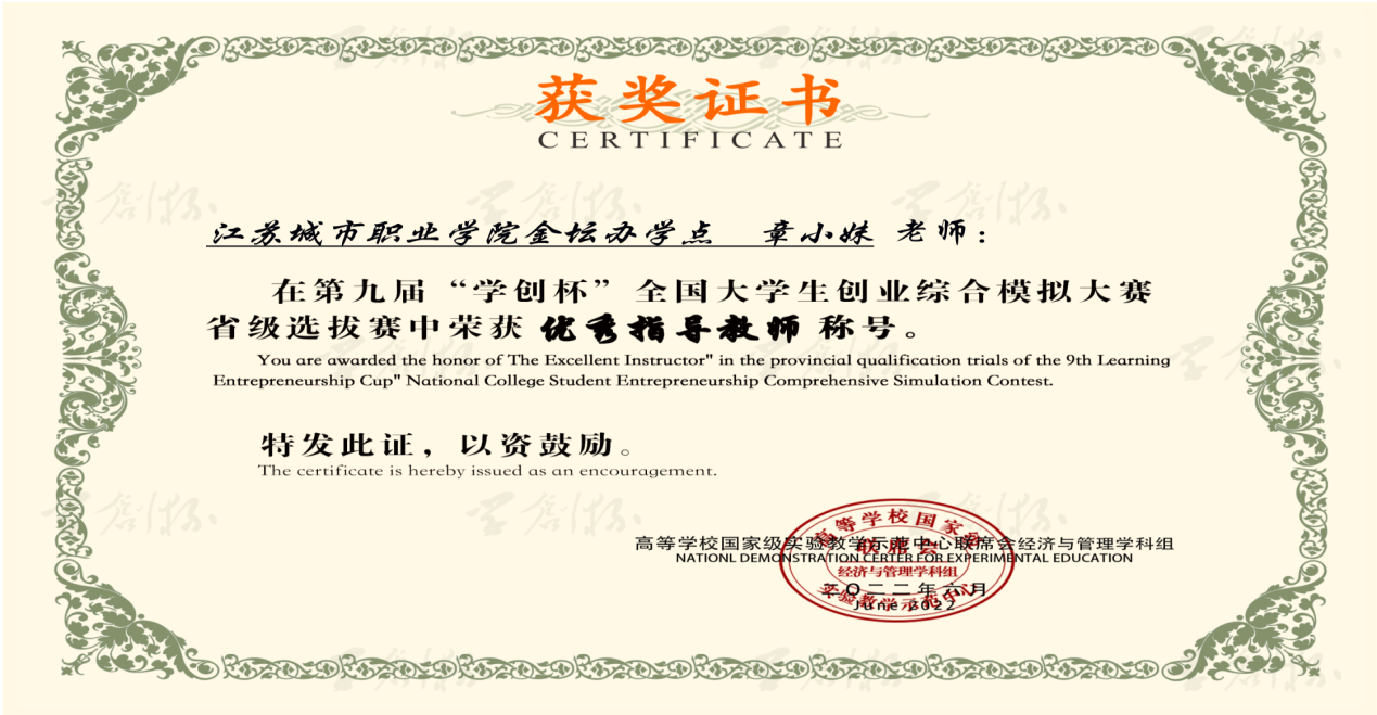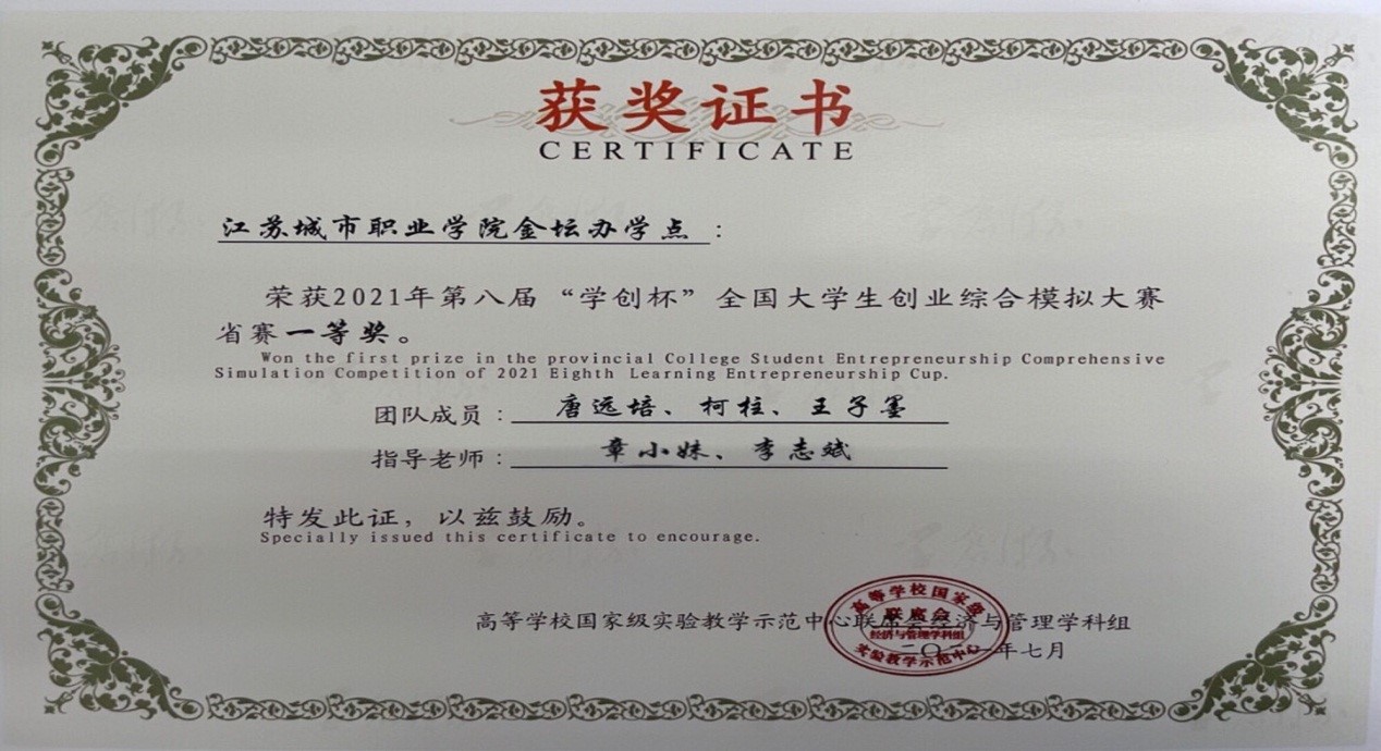 (1)在2022年5月第九届“学创杯”全国大学生创业综合模拟大赛江苏省主体赛道选拔赛中,章小妹指导唐远培团队荣获江苏省“特等奖”!章小妹老师获“最佳指导老师”。