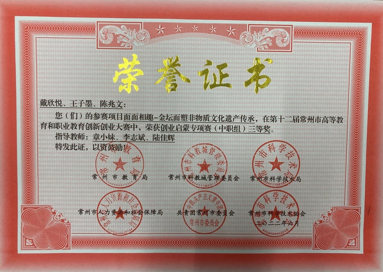 (5)2022年6月 章小妹指导戴欣悦团队参加第十二届常州市创新创业大赛获常州市“三等奖”