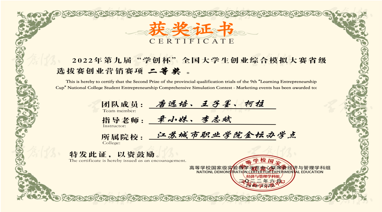 ()(3)在2022年6月第九届“学创杯”全国大学生创业综合模拟大赛江苏省专项赛道选拔赛中,章小妹指导唐远培团队荣获江苏省“二等奖”!章小妹老师获“优秀指导老师”。