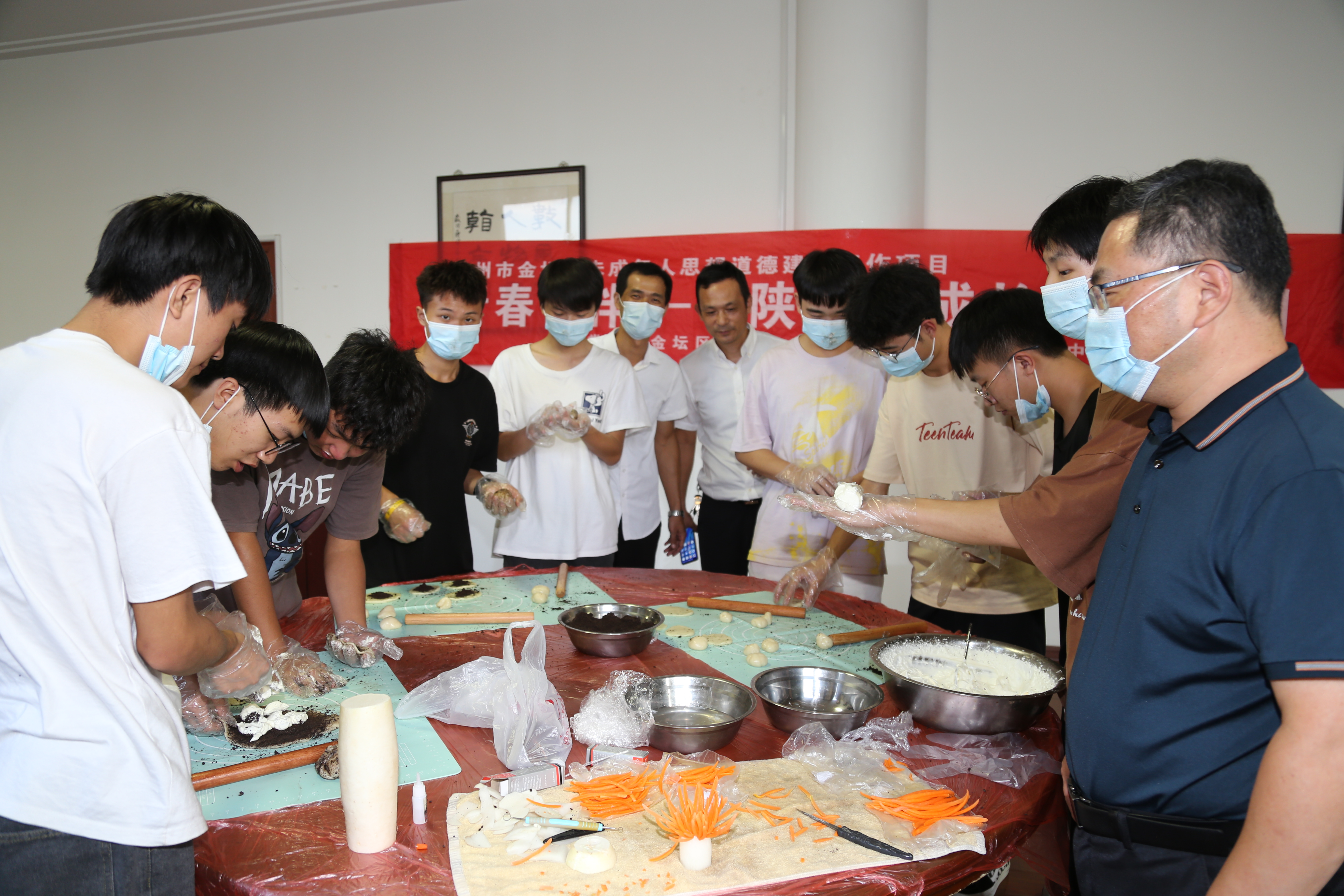 烹饪专业林华老师早早整理清洗了用具,准备好了原材料,指导同学们DIY制作冰皮月饼。一切准备就绪,同学们早就跃跃欲试,一声令下,大家忙开了,揉团、压饼、放馅,虽然形状不是很美观,但同学们依旧兴致勃勃。看到一个个赏心悦目的冰皮月饼在自己手里诞生,中秋团圆的节日氛围也越发浓厚了。接下来,林老师给同学们示范食品雕刻--菊花。用白萝卜作枝干,胡萝卜切丝做菊花瓣,一朵朵栩栩如生的菊花就展现在大家面前,寓意中秋赏菊,花好月圆,祝福同学们中秋节快乐。