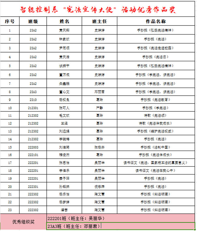 5.本次智能控制系“宣传大使”活动通过评选,共有23个作品入围优秀作品,222201班与23A3班被评为本次活动的“优秀组织奖”,现公布本次活动的获奖名单,祝贺获奖者们!