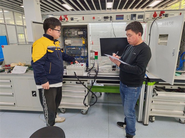 考核分为理论和实操两部分。理论考试90分钟开卷,主要以选择题为主,通过查找手册等考查学生的机械、电工、液压等多学科知识的掌握情况。实操考试6.5小时,分为计划、检查、实施,要求学生能根据任务的要求独立完成钳工的加工、装配,电气的接线、调试等。最后通过机、气、电的配合,进行连贯的加工运行过程,整个过程的学习及最后考核都是依照德方的要求,提高了学生的动手能力和专业知识。考官们严格按照德方考试的标准要求对学生进行合理评价,认真履职、公平公正。