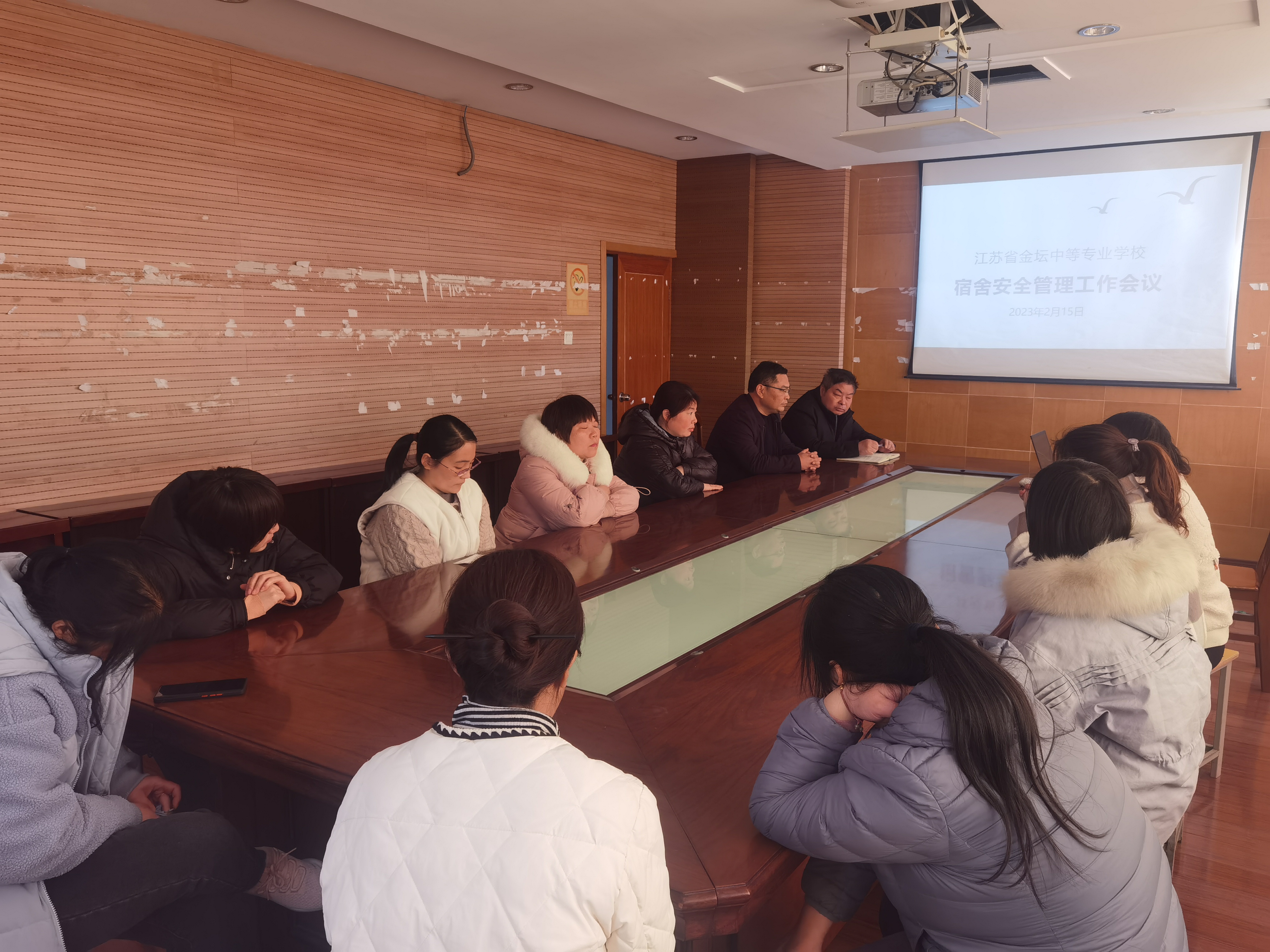 为做好新学期安全防范工作,切实保障住宿学生安全, 2月15日中午,在行政楼二楼会议室召开宿舍安全管理工作专题会议,汤英俊副校长、后勤服务处陈亮处长、学生工作处蒋云霞副处长及全体宿舍管理员参加会议。