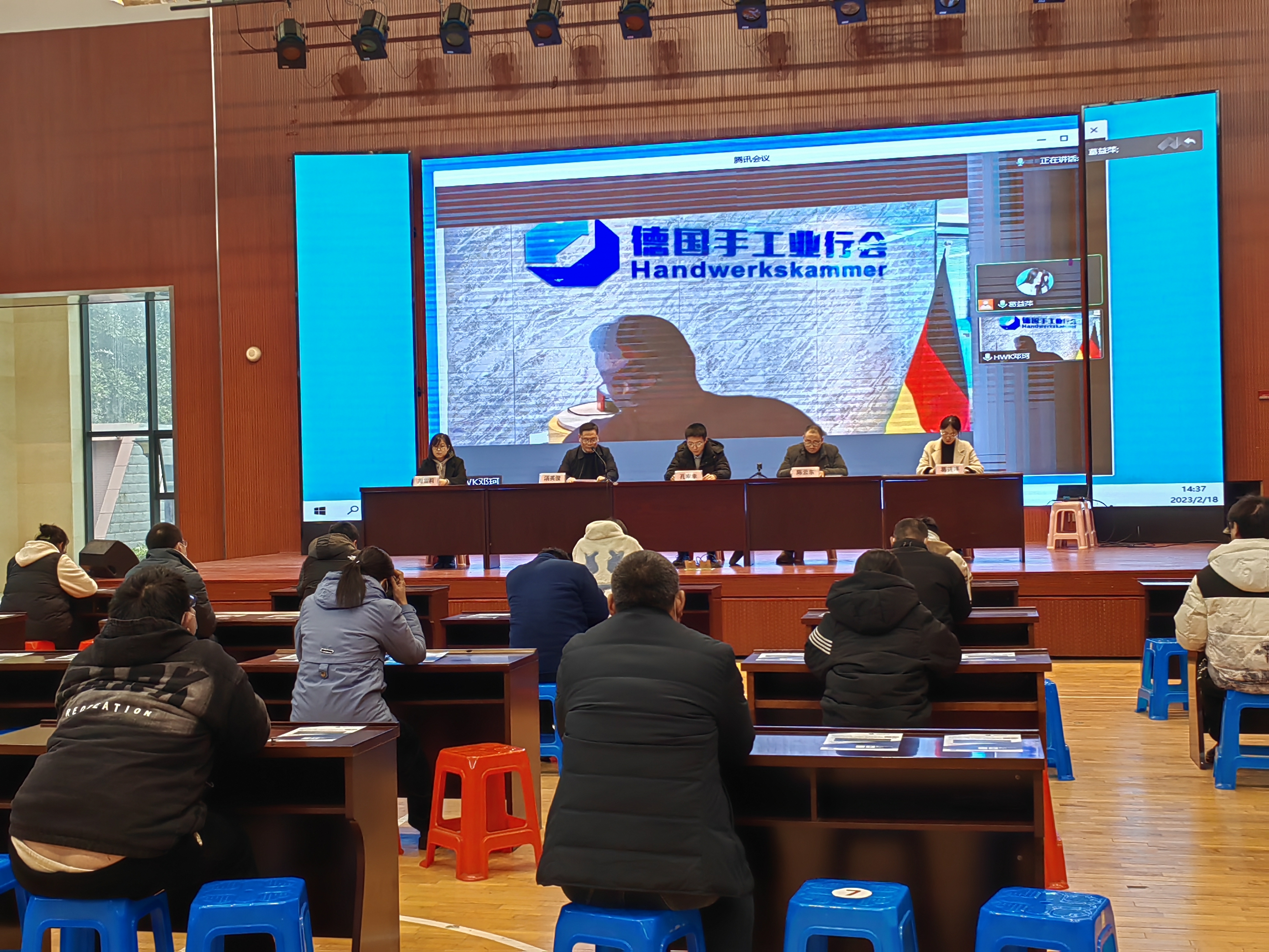 随后德国手工业行会HWK中国部首席代表邓珂、 HWK德国培训专家Horst Stadler视频参会,介绍了德国职业教育情况以及德企对员工能力素质的期望、中德国际班的具体开班情况。最后学生及家长参观我校中德(双元制)考培中心。