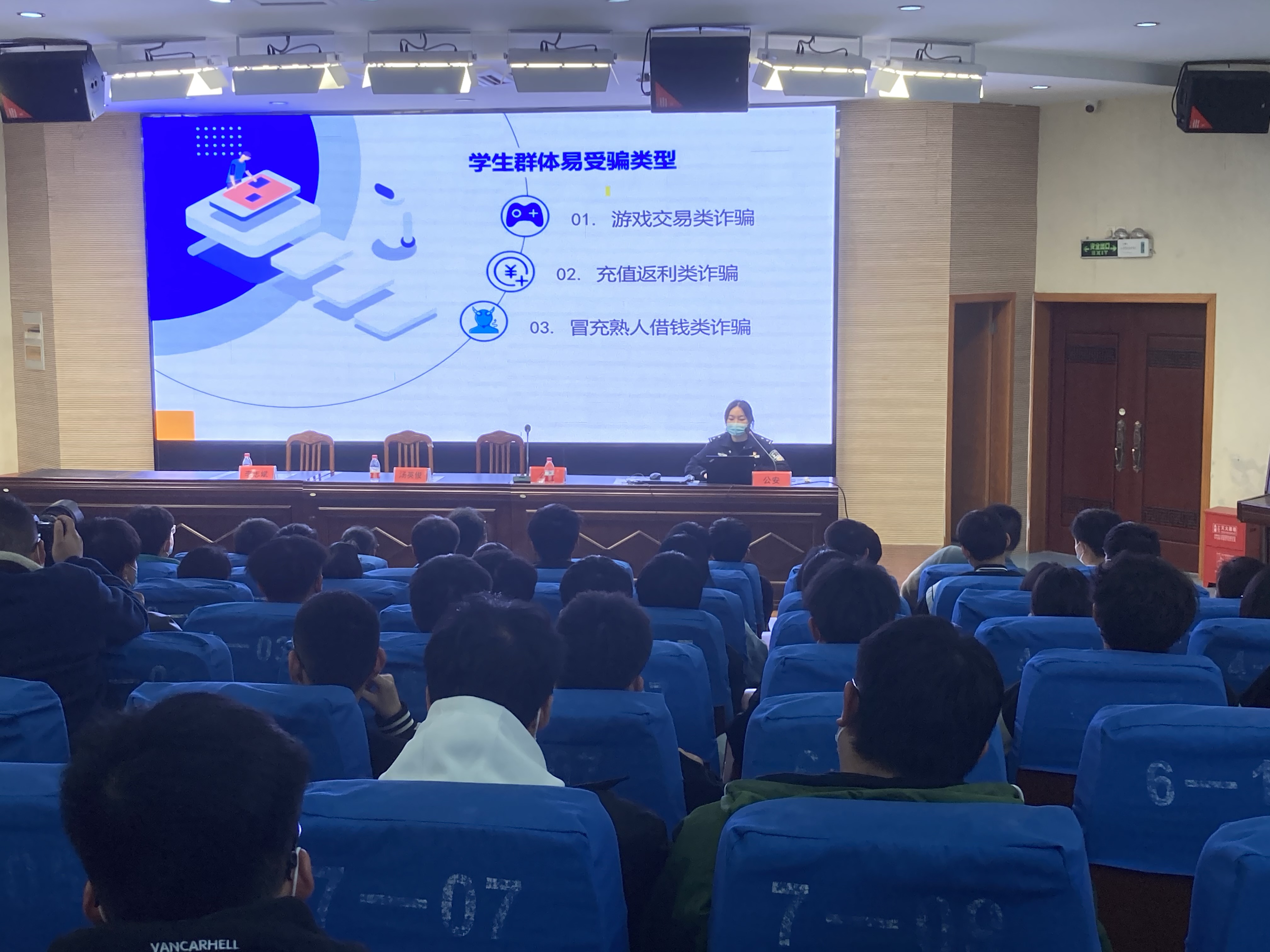 同时结合真实案例,对校园常见的冒充客服、代办贷款、兼职刷单、冒充公检法、注销“校园贷”等多种诈骗手法进行了逐一讲解。并告诫广大师生,不要被假象所迷惑,不要贪图小便宜,不要为盈利骗局所诱惑而上当受骗,遇到各种骗局要做到“不理睬,不转账,不轻信,不汇款”,最后提醒同学们要掌握防诈骗知识,树立防诈骗意识,提高警惕,切实增强安全防范意识,防止上当受骗。