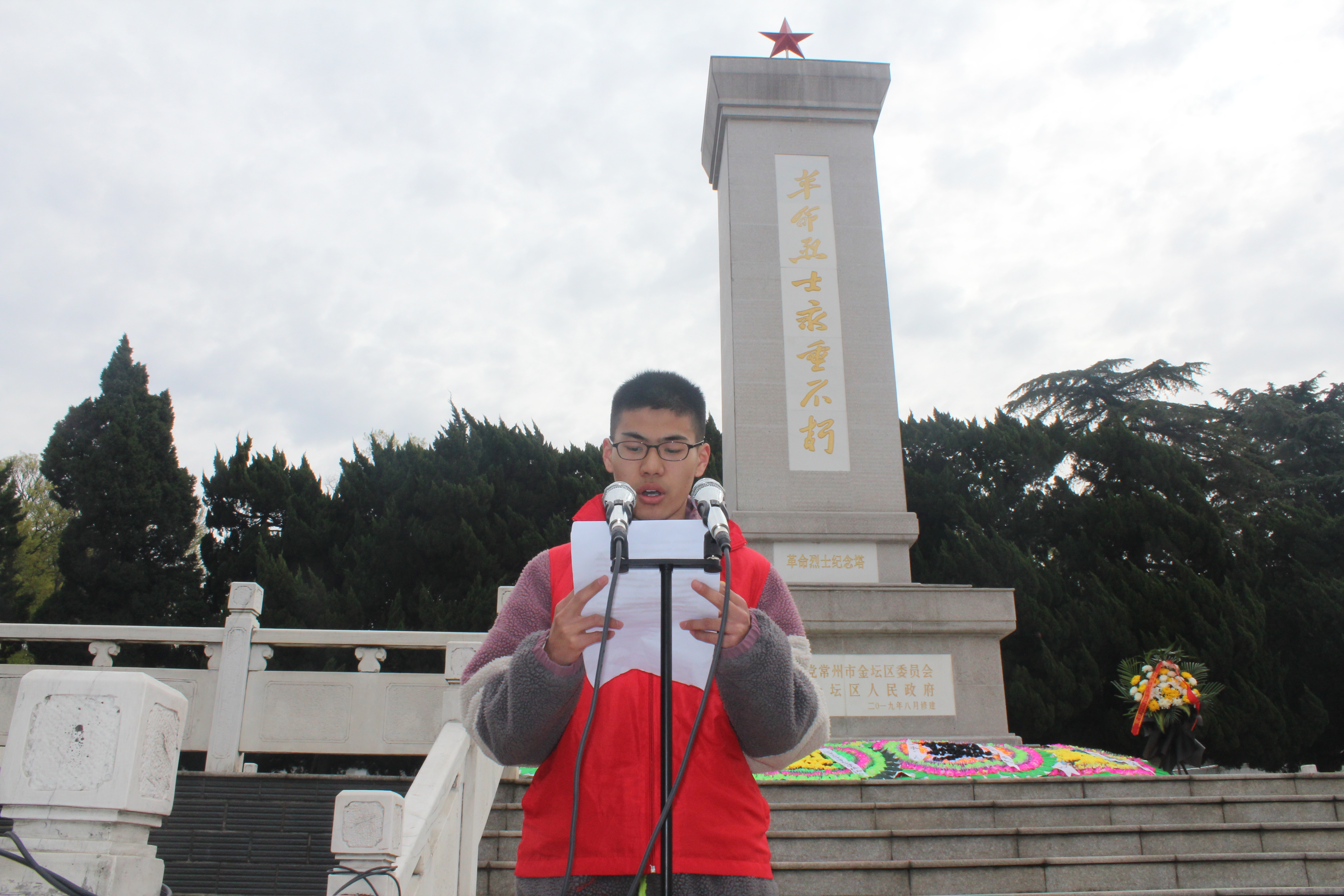 紧接着,学生代表陈佳豪在纪念碑下向烈士献词,追思他们为国为民的高尚情怀,铭记源远流长的民族精神,表达当代职校生的敬仰之情,告慰烈士先驱的在天之灵,激扬同学们的澎湃斗志!