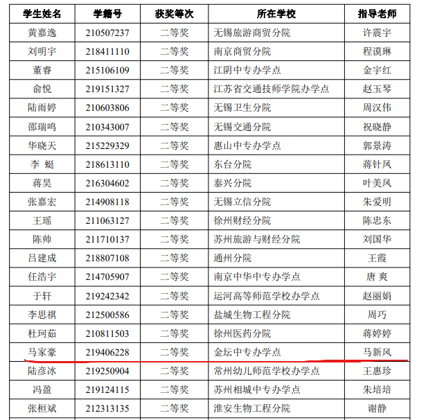 在刚刚结束的江苏联合职业技术学院第四届学生数学能力比赛中,汽车工程系214302班马家豪同学荣获二年级组二等奖;经贸管理系213301班罗晶晶同学荣获二年级组三等奖。