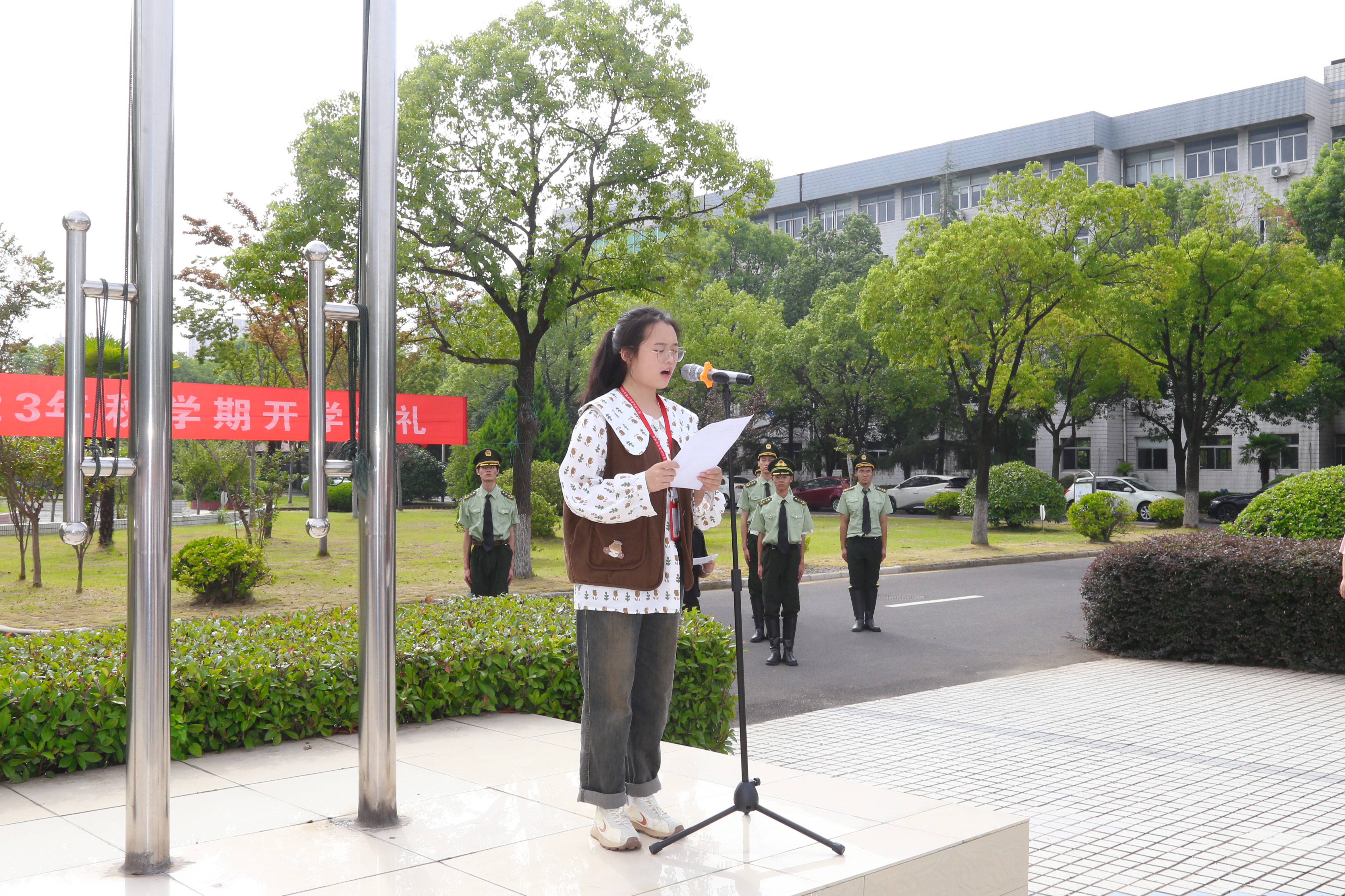 国旗护卫队在全校师生的注目下,踏着正步,徐徐走来。在慷慨激昂的国歌声中,五星红旗冉冉升起,拉开了开学典礼的帷幕。