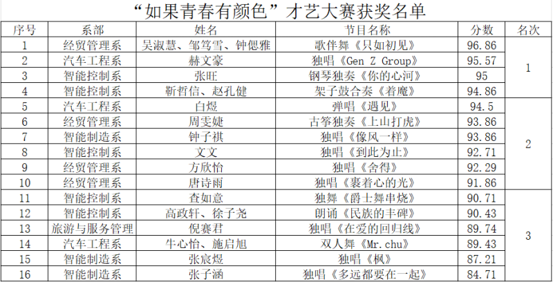 整场比赛高潮迭起,精彩不断。体育馆内始终洋溢着热烈、欢乐、积极向上的氛围。经过激烈角逐和专业评委的公正评判,最终评选出一二三等奖,如下: